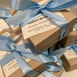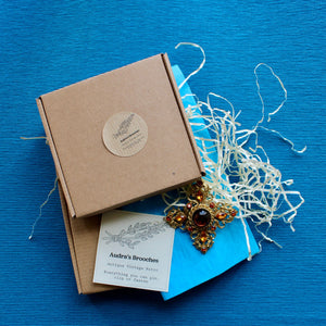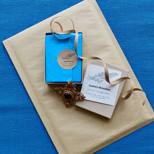 Most Economical Option! Your brooch will be wrapped in tissue and nestled in shred accompanied with a supportive sponge and business card, within a small postal box. This style of packaging is suitable for gift giving. The postal box fits through a standard letterbox.